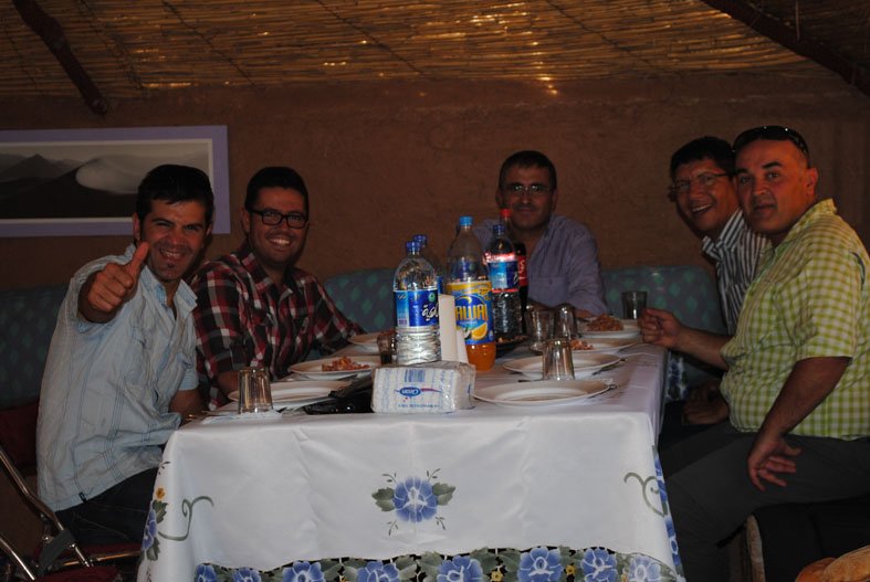 Durante la cena hablamos de la ruta que hicimos y si era apta para los futuros bikers. La calificación es positiva, una ruta sin muchos desniveles y bastante rodadora. En la foto de la izquierda podeis observar como se puede dejar el stress al que nos vemos sometidos a diario en las ciudades. Tan solo con una buena conversación, escoger el lugar que mas te guste de la jaima y un cojin es suficiente para que te relajes, no hay prisa, no hay móviles sonando. Durante el té, nos acordamos de aquella mujer que nos paro en la ruta y nos quería decir algo y le preguntamos a Mbark, lo que nos dijo nos sorprendió a todos, nos estaba ofreciendo leche y queso, ya que tenia un excedente y no quería tirarla. Increible como esta gente te da lo poco que puedan tener sin pedirte nada a cambio. Espero poder volver a verla para agradecerle ese gesto. Esa misma noche Mbark nos presenta a D. Rguibi Jandali (Alcalde de Labyar), el mejor guía de la zona que podíamos tener para preparar la larga ruta de la mañana siguiente.