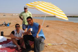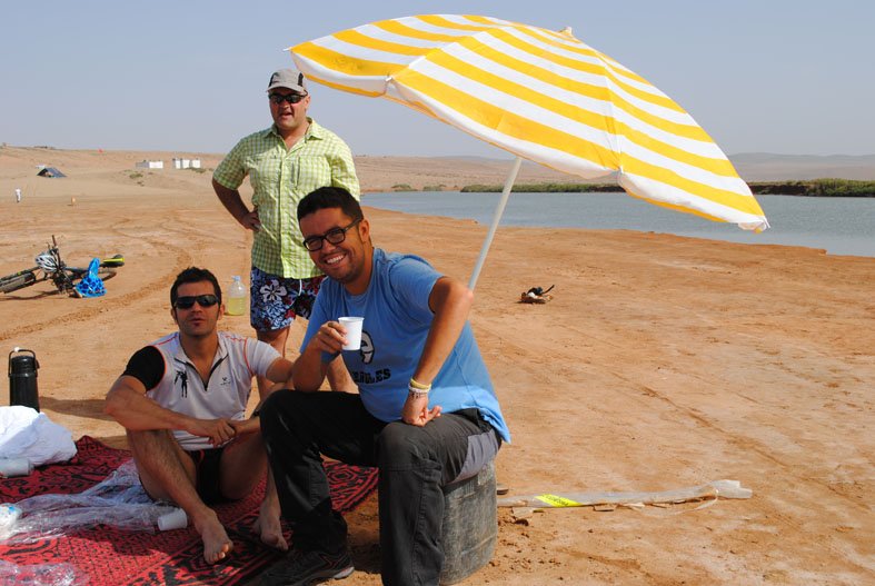 Por motivos climatológicos decidimos montar las bicis en el coche y trazarla, nuestro objetivo era llegar a Playa Blanca, con una distancia cerca de los 40 km, solo de ida, para luego volver por diversos caminos. Con dos todo terreno, uno conducido por Mbark y el otro por Rguibi, comenzamos la ruta, el principio era el mismo tramo que el de la llegada de la ruta corta, a los 14 km decidimos empezar a rodar con la bici, de nuevo mucho calor, empezamos suave, rodando juntos para no quedarnos solos,el terreno siempre firme solo encontramos pequeños bancos de arena cuando cruzabamos partes de un rio seco. En una pequeña subida Fernando pincha por culpa de las afiladas piedras del camino, pero como el mismo Macgyver hubiera echo, la reparamos con un poco de maña, de esta manera pudimos continuar. El terreno era rodador, solo unas pequeñas montañas nos hacían recordar que todo no era tan fácil, en los cruces del río aprovechavamos para refrescarnos y nos metiamos dentro de ellos con las bicis. Cuando ya íbamos a cumplir el kilómetro 27, a lo lejos una colina que anunciaba Playa Blanca, el final de la ruta, la sensación fue extraña, nos quedaban poco mas de 10 km pero a la vista parecían muchísimos más. Descendimos por la colina a toda velocidad, dando saltos, cambiando de dirección, pedaleando todo lo que podíamos, nos divertíamos, cada vez veíamos más cerca la zona de llegada. Siguiendo por la rivera del rio llegamos a Playa Blanca, una zona de arena y kilométrica playa, habiamos realizado el primer tramo de la ruta.